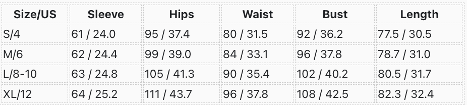 | Size/US | Sleeve | Hips | Waist | Bust | Length |