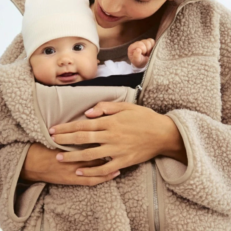Plush teddy fleece wraps you in warmth without the bulk, cut loose for growing bellies and baby carriers alike. A jersey-lined panel integrates when needed, detaches when done - this is outerwear that grows with you, not against you.