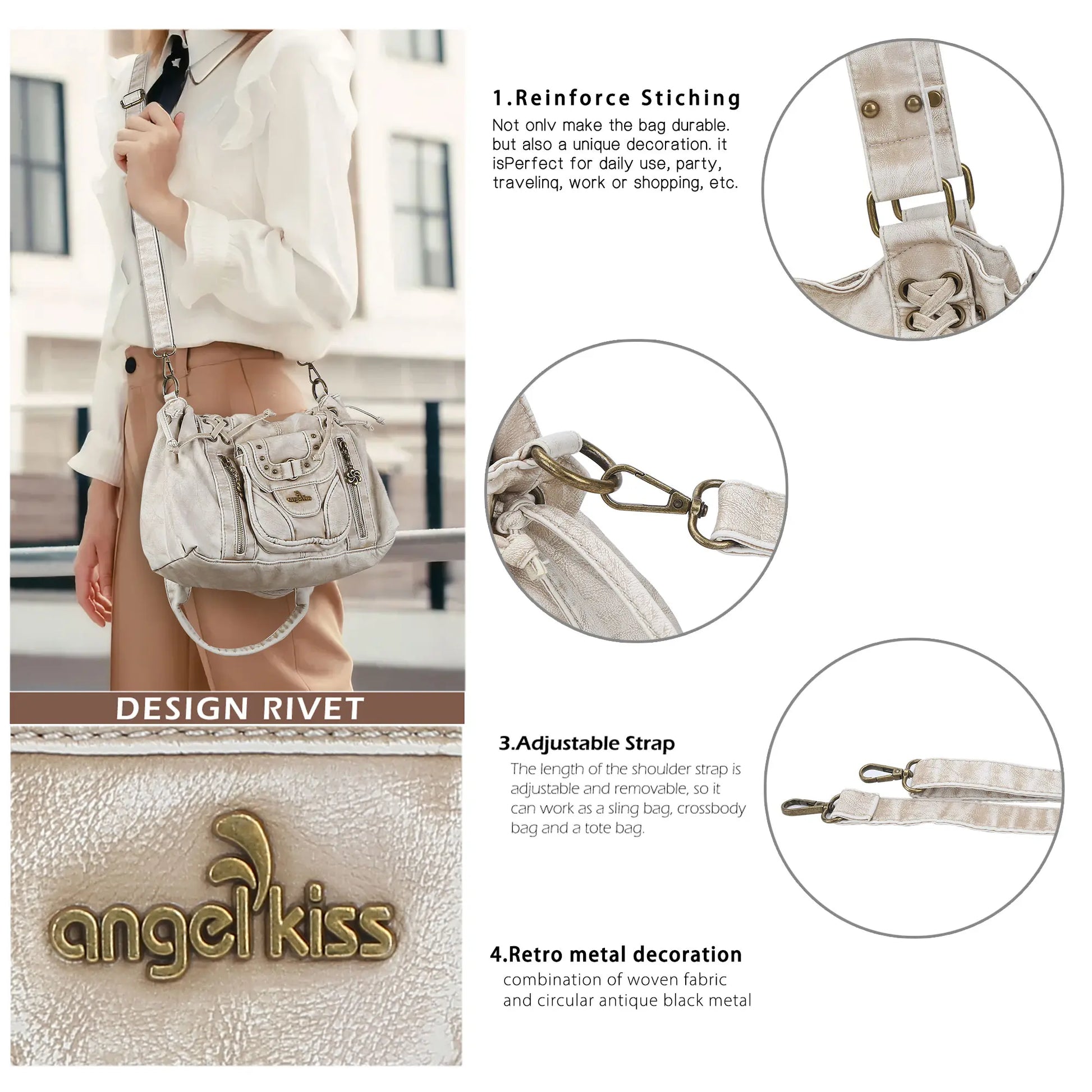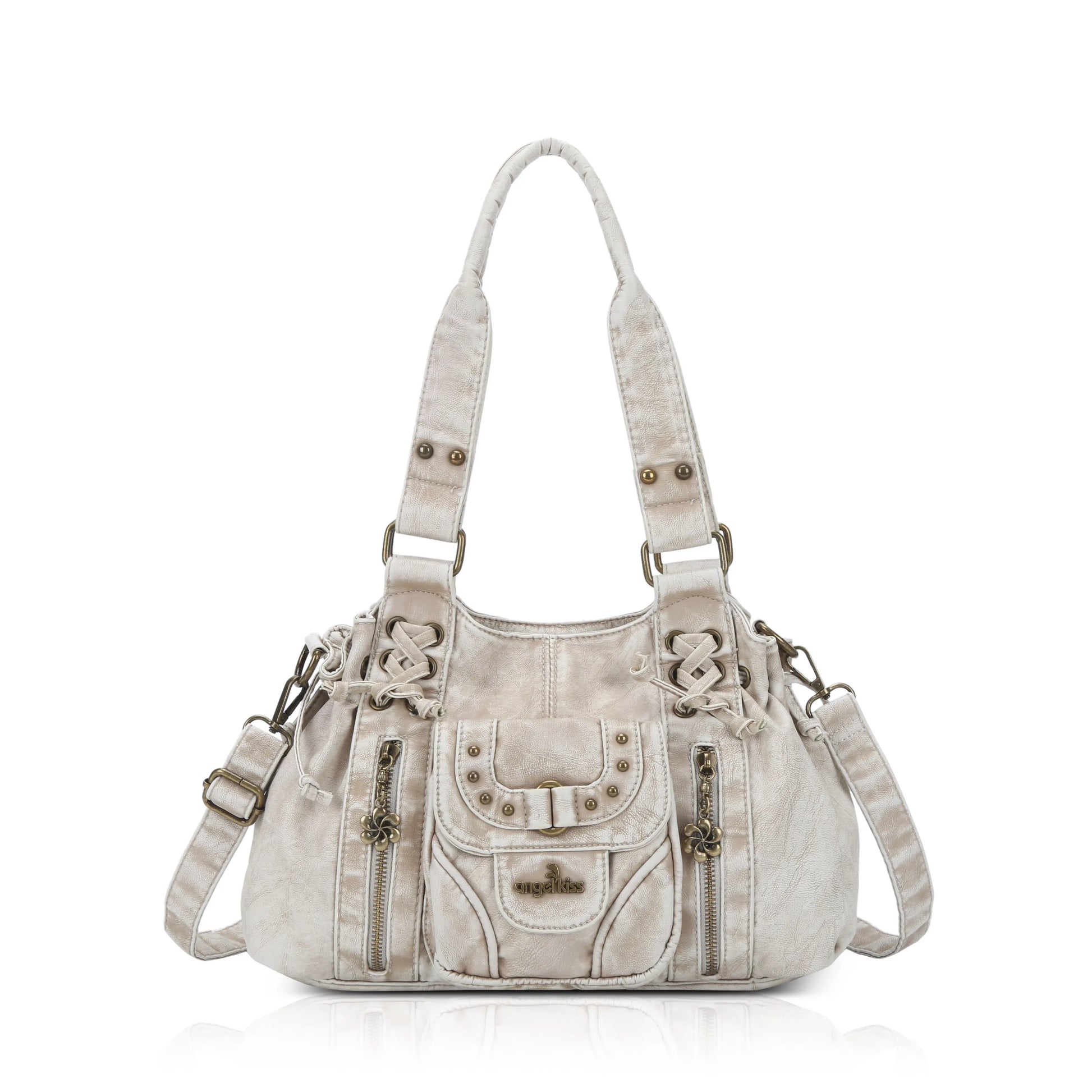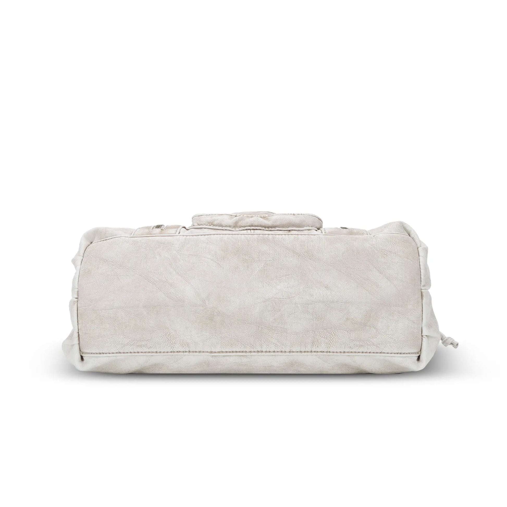 This vintage-inspired white handbag from Angelkiss is crafted from soft vegan leather with a slightly distressed finish—subtle, yet full of character. Featuring studded flap details, metal zippers, and crisscross lace-up accents, it blends classic craftsmanship with a modern street-style edge.